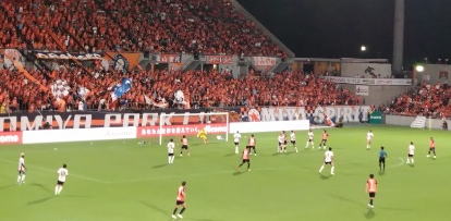 ▼ 杉本選手のヘディングが決まった瞬間。場内、大歓喜。